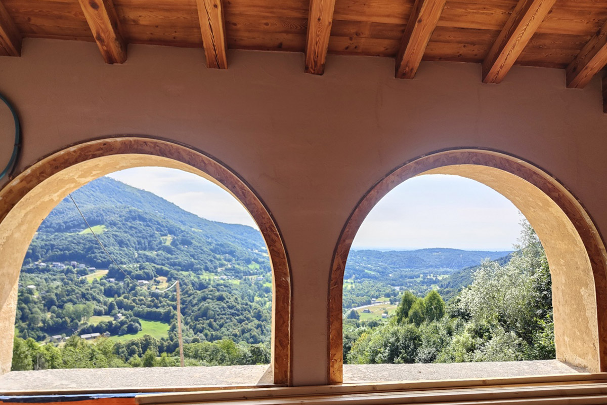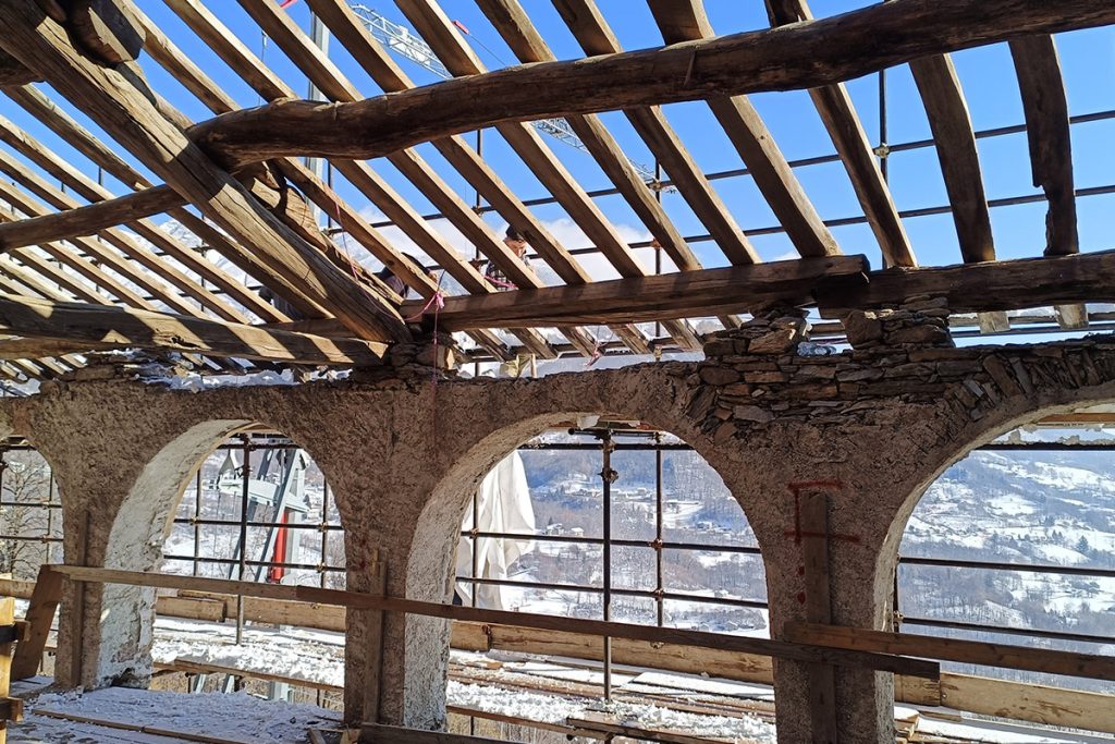 L’intervento, attualmente in fase di completamento, ha interessato un vecchio rudere costituito da murature in pietra e arcate tipiche della Valchiusella, mantenute e consolidate secondo le richieste del committente, fortemente orientato alla conservazione dell’identità originaria. Una controstruttura interna in cemento armato supporta i nuovi impalcati in legno, interamente rifatti, mentre la travatura del tetto è stata realizzata in legno di castagno recuperato, con copertura in lose di pietra. Un annesso è stato demolito e ricostruito per ospitare locali di servizio collegati alla casa.