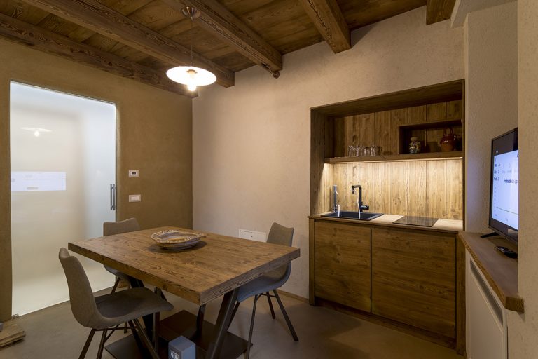 Ogni locale è stato trattato con tecniche e materiali differenti per sperimentarne direttamente la messa in opera e offrire ai clienti la possibilità di vedere e toccare materiali naturali e sostenibili.