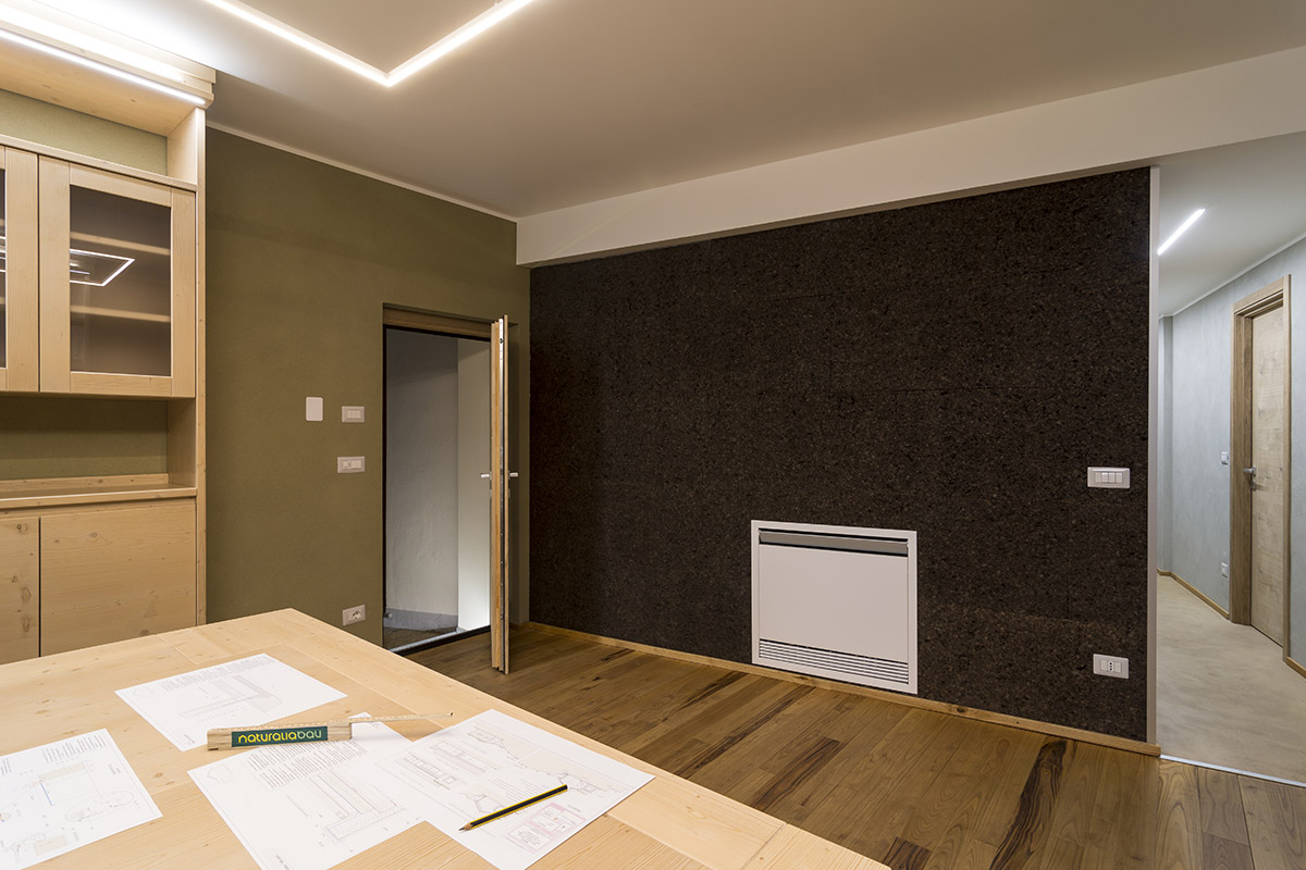 Ogni locale è stato trattato con tecniche e materiali differenti per sperimentarne direttamente la messa in opera e offrire ai clienti la possibilità di vedere e toccare materiali naturali e sostenibili.